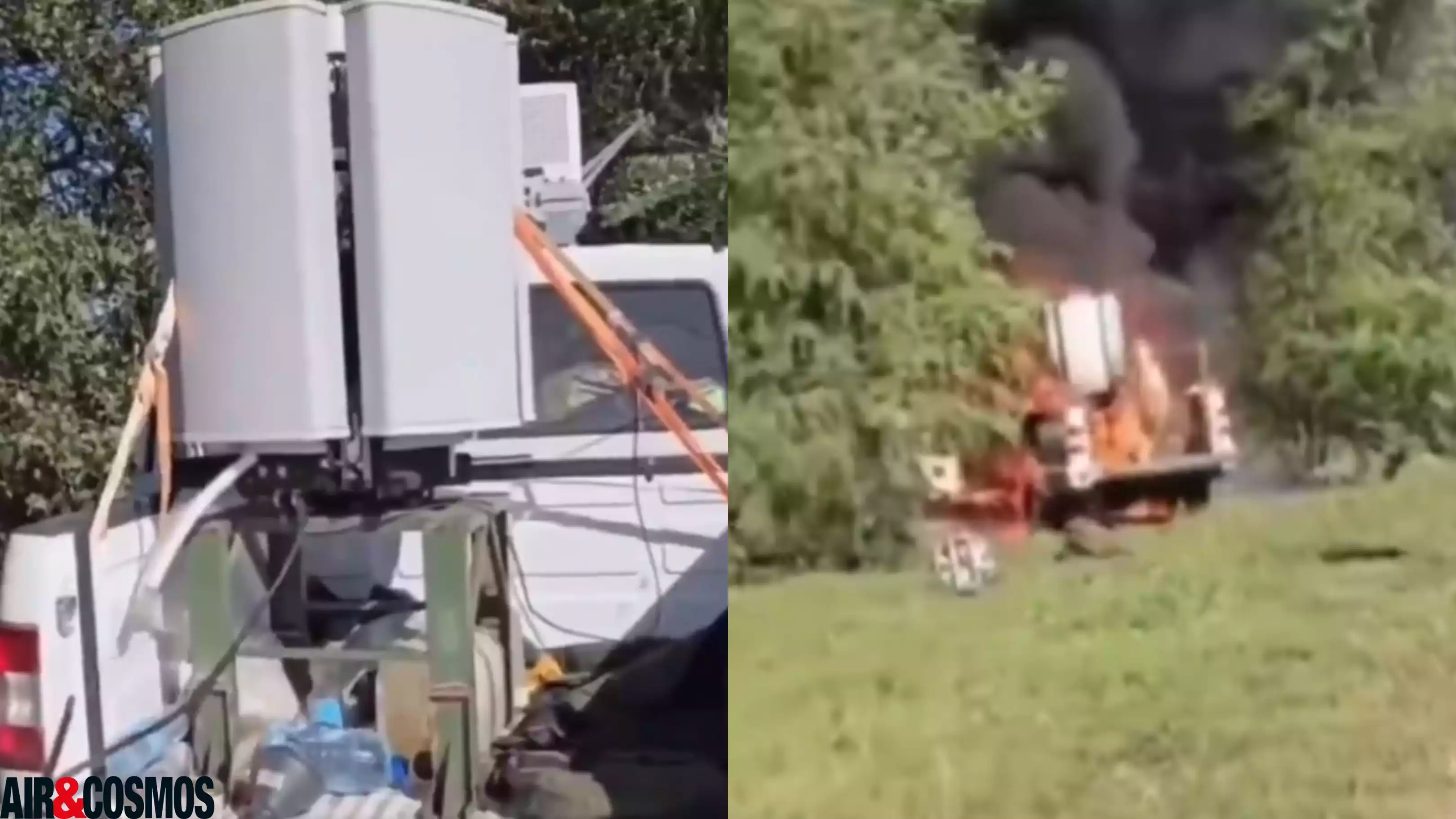 En effet, ce deuxième système est très certainement un brouilleur à 360°, placé à l'arrière d'un véhicule tout-terrain. Cependant, la seconde partie de la vidéo est filmée sur un tout autre ton. En effet, elle montre alors que le véhicule est en feu, avec un militaire russe essoufflé et dépité qui annonce :
