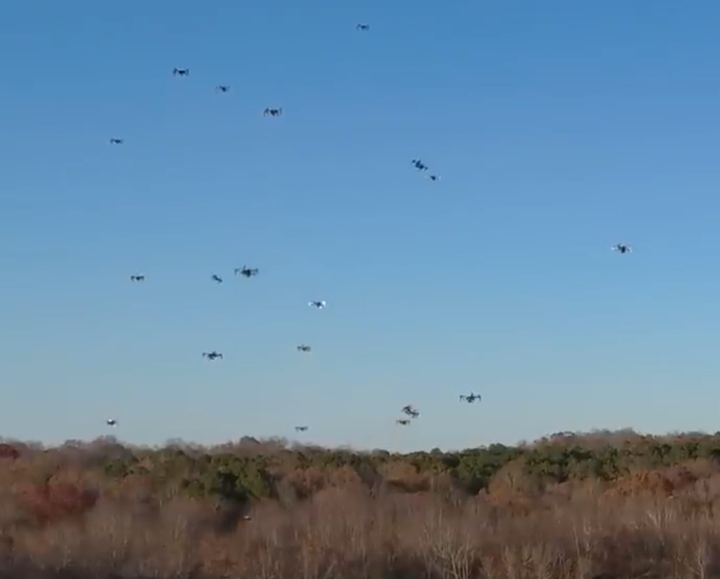 En novembre, c’était au tour de Raytheon de faire voler un essaim de 130 drones physiques et 30 drones virtuels. L’utilisateur possédait un set de réalité virtuelle. L’essaim était également autonome : si l’utilisateur souhaitait cartographier un immeuble, le système définissait automatiquement le nombre de drones appropriés, tout en sélectionnant les plus proches et les plus spécialisés pour ce type de mission.