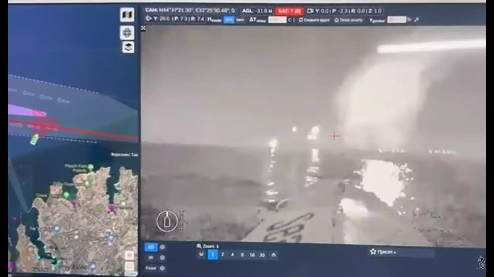 Peu avant la fin de l'année 2023, la Marine ukrainienne a une nouvelle fois attaqué Sébastopol (Crimée). Les moyens sont connus car une vidéo a été publiée par le journal ukrainien Ukrainian Pravda (UP), dans un article publié le 1er janvier 2024 (vidéo ci-dessous). Il est possible d'identifier un drone de surface (USV) de type Sea Baby, notamment grâce aux trois premières lettres visibles sur sa proue ("Sea"), sur le côté bâbord (gauche) de l'USV. Cependant, contrairement aux précédentes attaques d'USV contre des navires russes ou contre le pont de Crimée, le drone en question ne s'est pas écrasé contre un autre bateau : il a tiré plusieurs roquettes. Un second USV, probablement un autre Sea Baby, était également déployé, la vidéo montrant des roquettes tirées à bâbord (gauche) de l'USV filmant cette attaque.