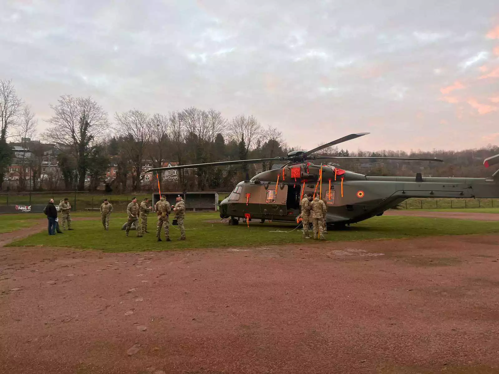 Mais où se trouve le NH90TTH ? Les informations disponibles en sources ouvertes (OSINT) permettent de confirmer que l'équipage a pu se poser sur le terrain de baseball des Black Bears Andenne, au sud de Namèche, juste à côté de la Meuse. Les images montrent que l'hélicoptère ne semble pas sérieusement endommagé mais, pour rappel, moins de deux minutes auparavant, l'hélicoptère volait à une vitesse de 237 km/h : en plus d'un possible endommagement des systèmes électriques, l'hélicoptère peut avoir subi un choc ayant peut-être endommagé certains systèmes.